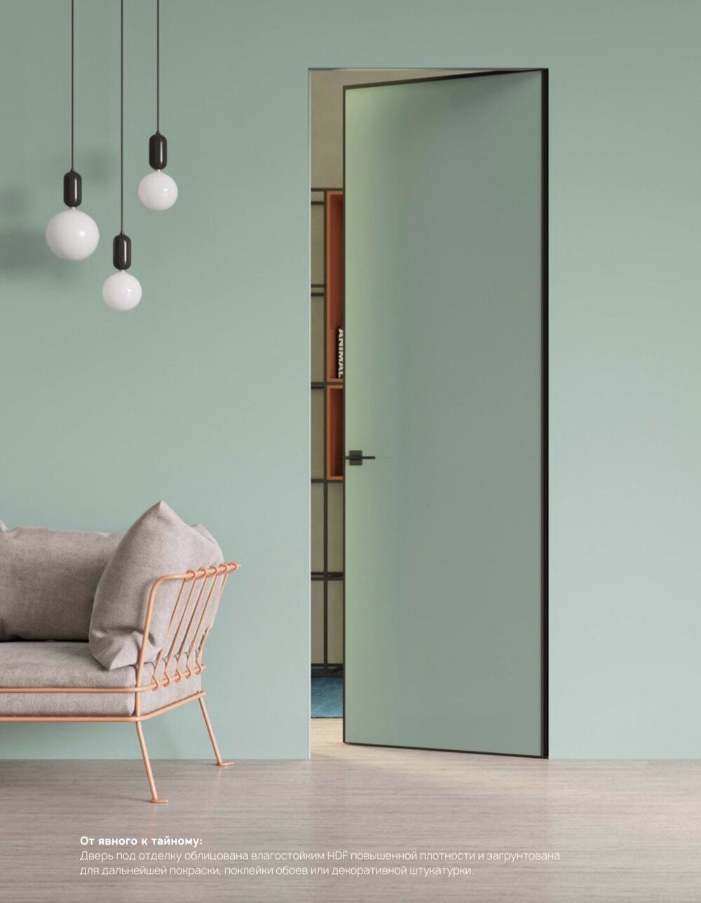• Для изготовления полотна используется специальный материал, оптимальный под покраску, оклейку обоями и даже отделку декоративной штукатуркой. При умелой отделке дверь станет невидимой и полностью сольется со стенами.