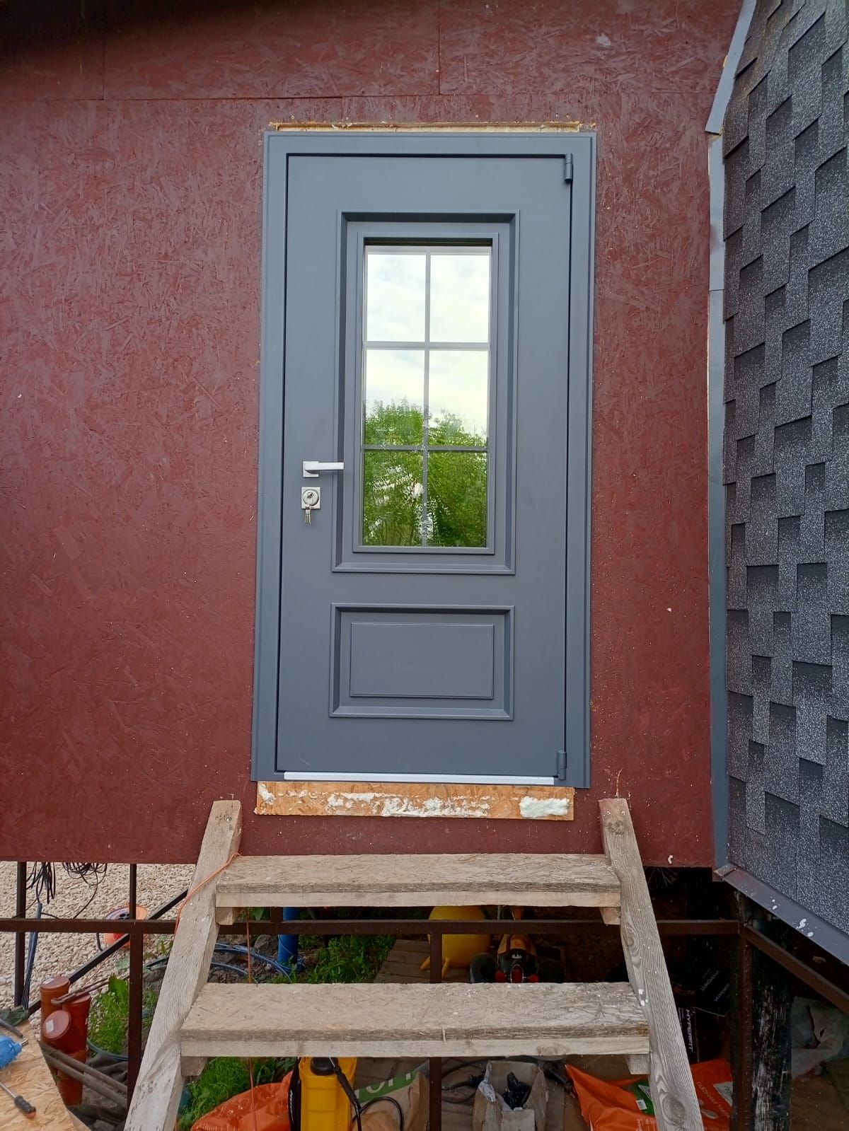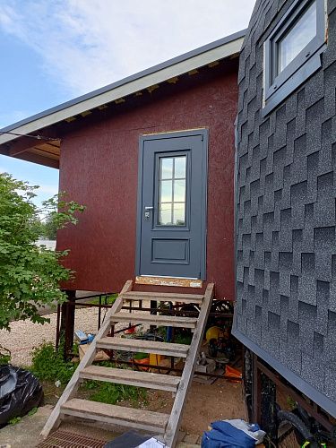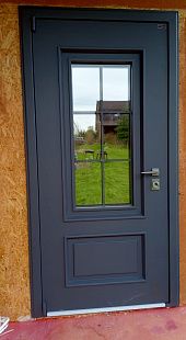 МДФ 10 мм, стеклопакет 2х камерный, внешнее стекло тонировано серебром, металлическая решетка окрашена в цвет наружной отделки